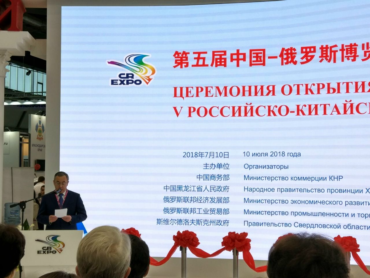 10:35. Продолжается церемония открытия Российско-Китайского ЭКСПО. С приветственным словом выступил министр промышленности и торговли РФ Денис Мантуров. Представитель Минэкономразвития РФ отметил, что товарооборот России и Китая за пять месяцев этого года вырос на треть и продолжает расти. Сказал, что правительство будет создавать все условия для снятия барьеров которые есть в торговом и экономическом сотрудничестве