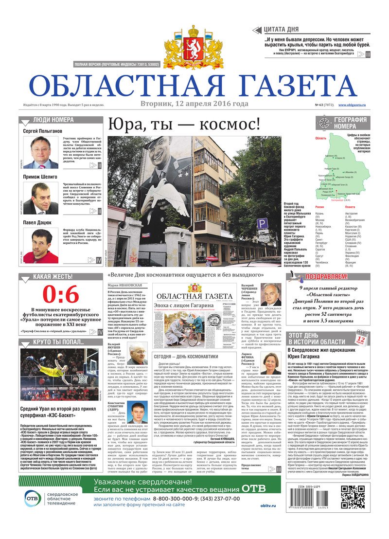 «Областная газета» № 63 (7872) от 12 апреля 2016 года