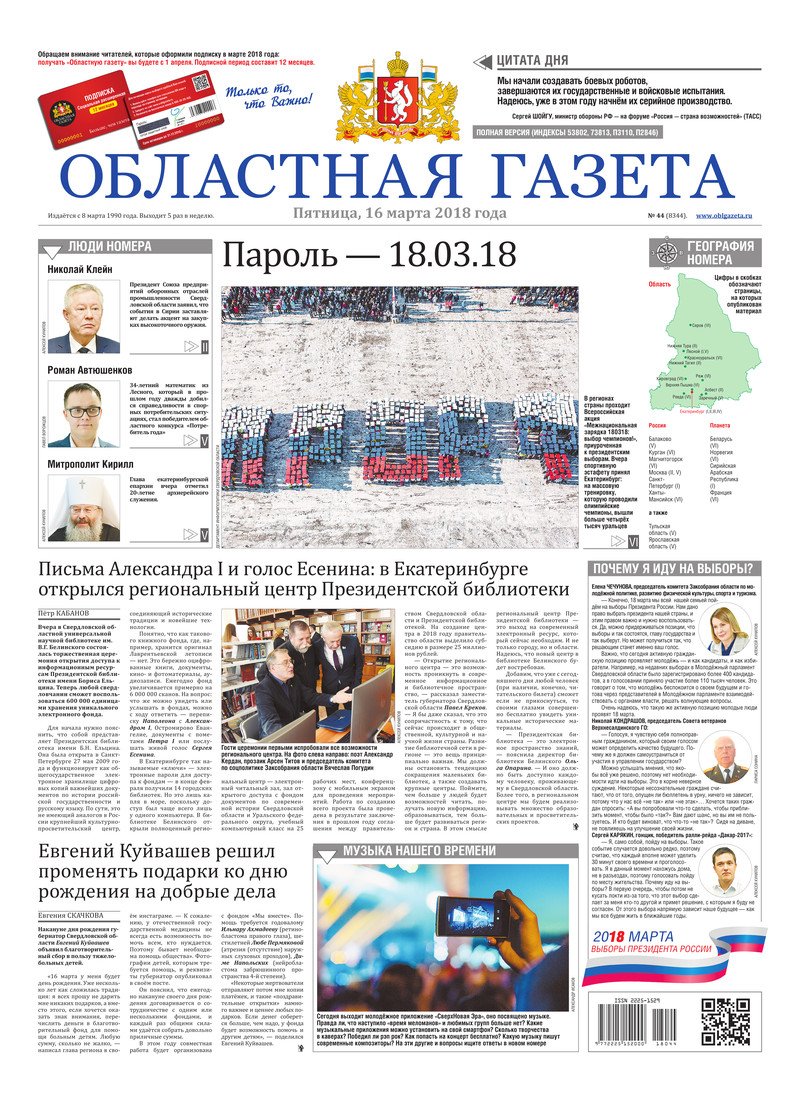«Областная газета» № 44 (8344) от 16 марта 2018 года