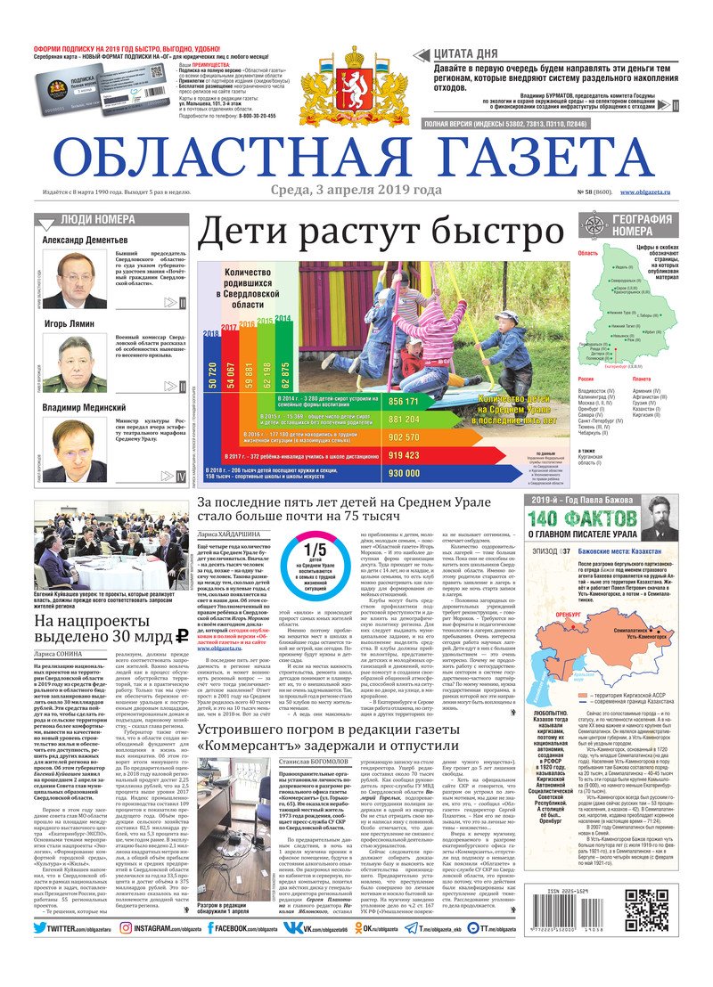 «Областная газета» № 58 (8600) от 3 апреля 2019 года