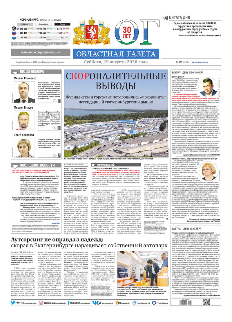 «Областная газета» № 159 (8943) от 29 августа 2020 года